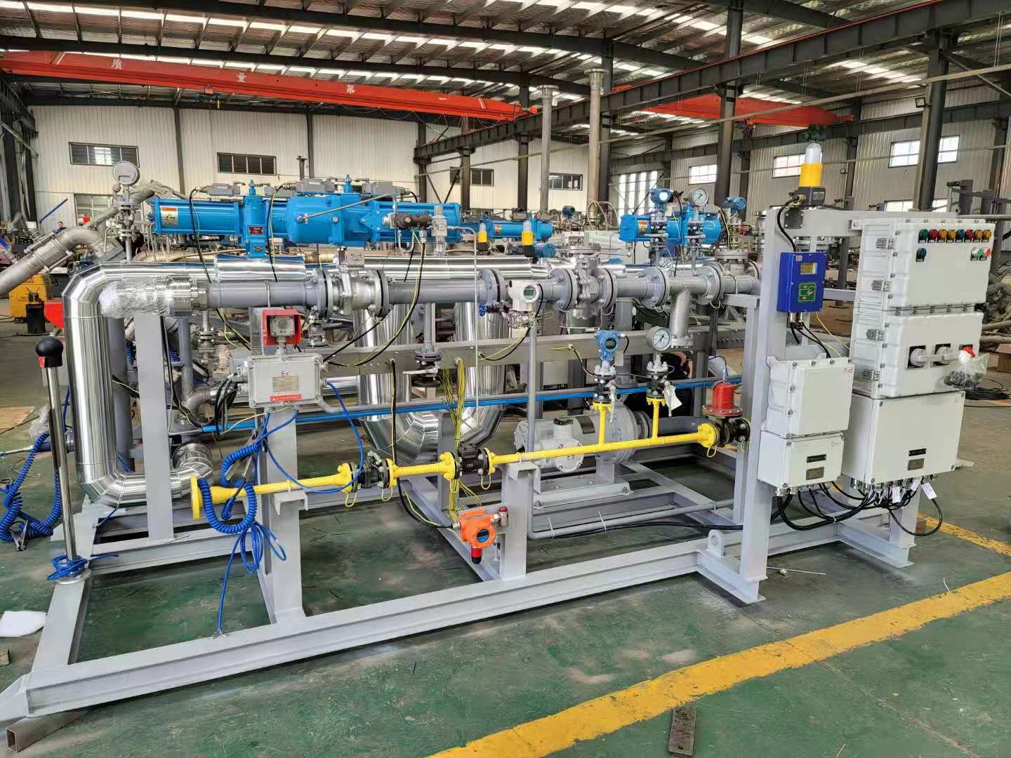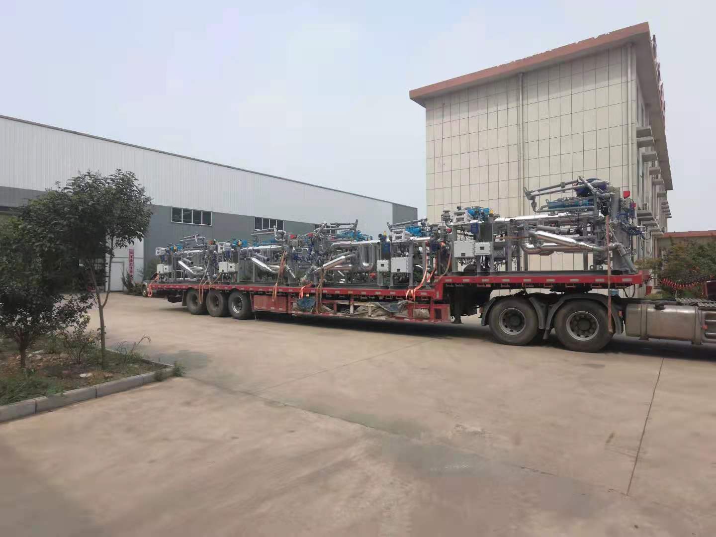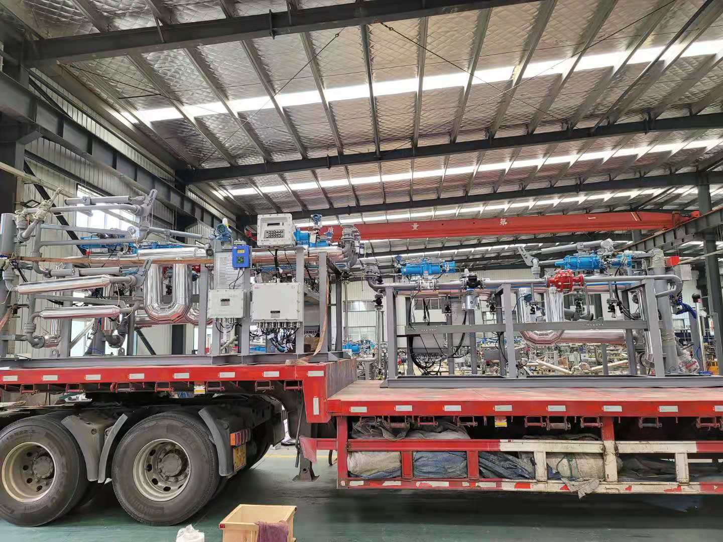 油品及化工品定量裝車橇裝組是指將每一個裝車鶴位內的儀表和設備集成在一個專用的框架結構內,儀表和設備包括裝車鶴管、流量計、防溢油靜電報警控制器、壓力變送器、裝車流量控制閥、緊急切斷閥,裝車泵、批量控制器等, 只預留工藝連接口和控制電源和通訊接口,這個整體集成部分稱為裝車橇。與傳統(tǒng)的裝車控制系統(tǒng)就地組裝比較,裝車橇可以節(jié)省現(xiàn)場設計和現(xiàn)場施工量,縮短項目工期,提高裝車控制系統(tǒng)的質量。以下是近期公司定量裝車撬的生產及發(fā)貨現(xiàn)場。
